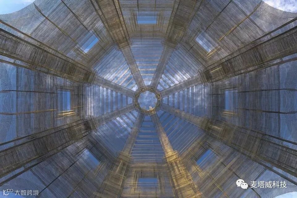 三个不同尺度透明金属网板所构成的空间模型,营造出意想不到的透视关系和光学效果,在人与天空之间建立了或远或近的距离关系。引用“ Christian Norberg-Schulz”的话说就是“能看多远,天空就有多大”,因此,当建筑自身被放大时,天空便似乎距离观察者更加遥远。