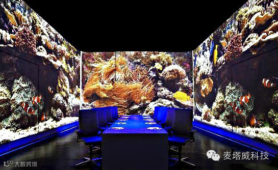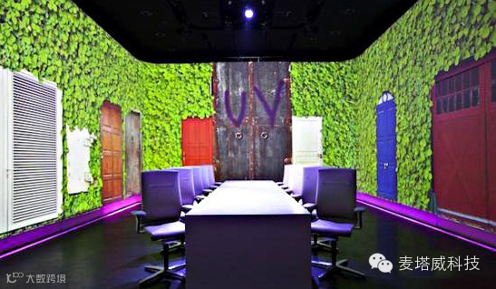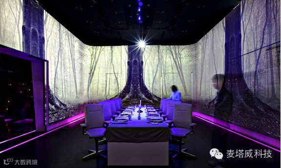 位于这个高耸白色空间的正中央,是一种类似“会议室”的摆设——一个巨大的白色长桌和10张白色工作椅。头顶上,有7部投影机和一系列镁光灯,空气中散发着某些未知香料的味道,这一切,都活似一个拍摄未来风格电影的制片厂。
