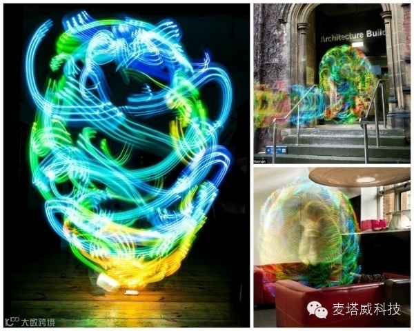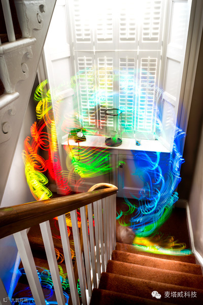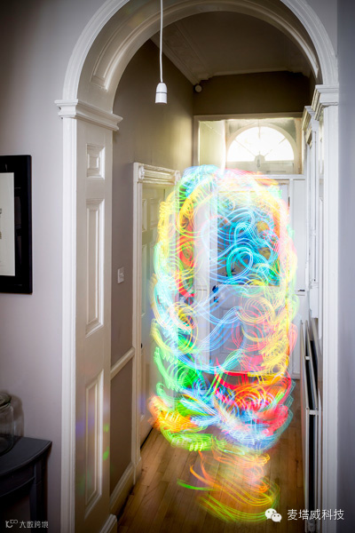 由赫南的公司Digital Ethereal开发的“克里安设备”(Kirlian Device),是一个能用LED仪表板把无线网络信号强度变成各种色彩的装置,红色代表高信号密度,而蓝色代表弱信号。通过用长曝光摄影追踪这个装置,本地网络就变成了可见的结构:你房间飘忽不定的网络信号变成了光涂鸦。这个装置也许可以帮助我们判断某个地下室是否值得一租(万一网络不好可不行)。