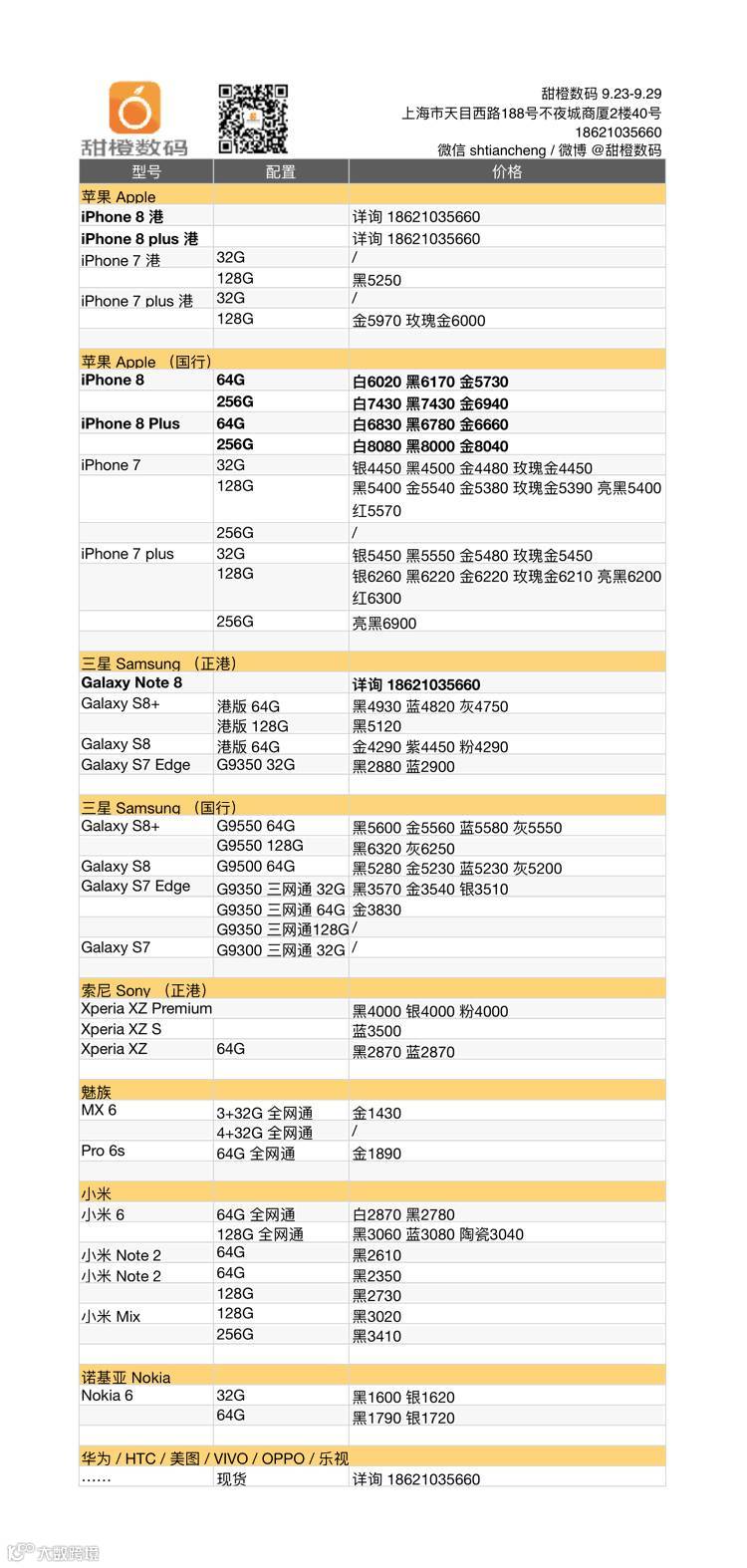 iPhone 8 及 plus 已到店开售,港版暂缓;iPhone 7 及 plus 暂未出现大幅走低;Galaxy Note 8 价格暂不稳定,S8/S8+ 价格出现小幅反弹;索尼各机型价格稳定;小米等国产机型小幅走低 20 元。