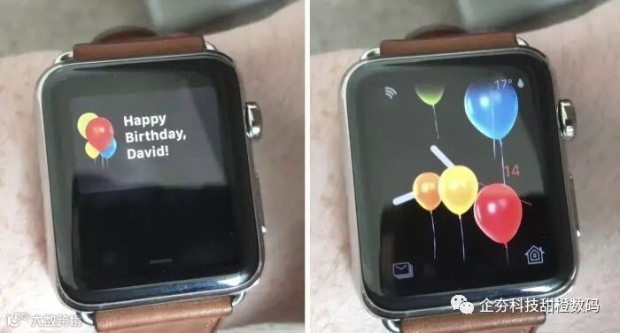 在生日当天,苹果会发出“生日快乐”通知提醒,当点击提醒后,可以看到表盘上飘过很多个气球,很类似于 iOS 10 信息应用中的气球全屏幕特效。