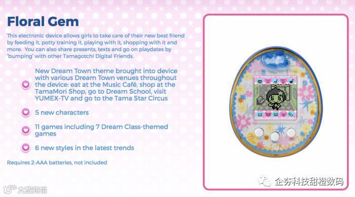 新版Tamagotchi依旧设计了6个角色,提供6种外形风格。这款产品的售价为1620日元(约合人民币102元)。