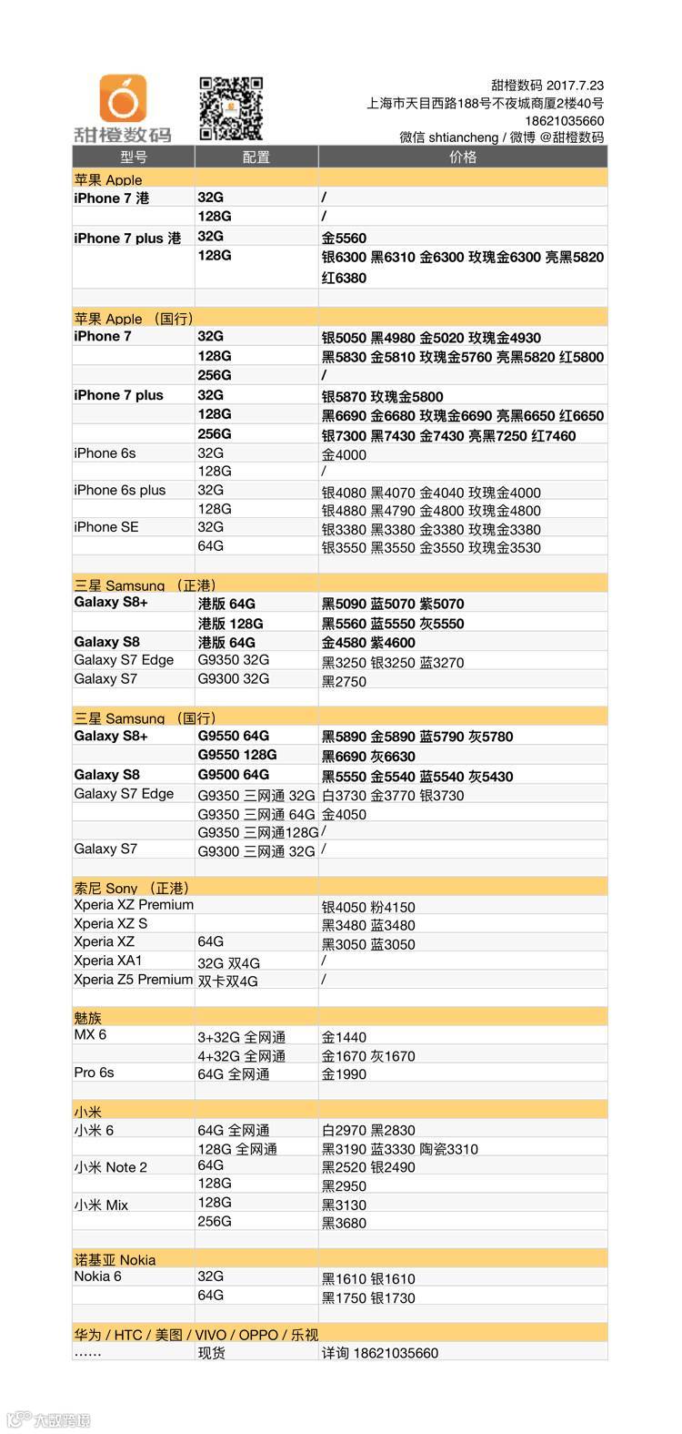 因为销量走高,iPhone 7 及 plus 国行版的 128G 价格仍有上浮,幅度在 30-50 元;三星 Galaxy S8/S8+ 港版机型继国行版后小幅下探,S7 Edge 港版机型也有降价。