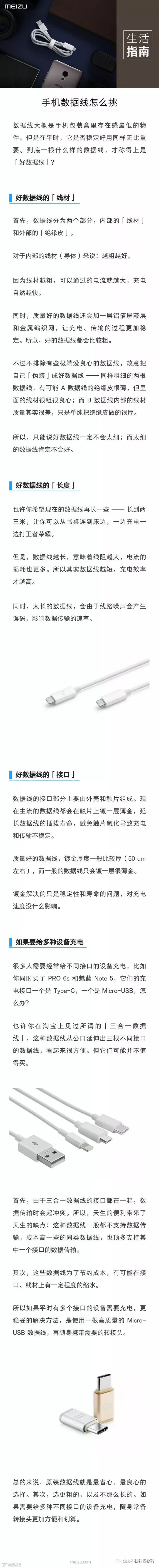 手机数据线谁都离不了,但存在感似乎又非常低,大多数人都是抱着能用就好的态度,但一根数据线的好坏,可以大大影响你的体验。到底什么才是好的数据线呢?魅族科技今天放出了一张科普图,深入浅出地回答了这个问题。首先在线材方面,越好的数据线,内部线材就会越粗,可以通过更大的电流,同时还会有铝箔屏蔽层和金属编织网,保证稳定性。