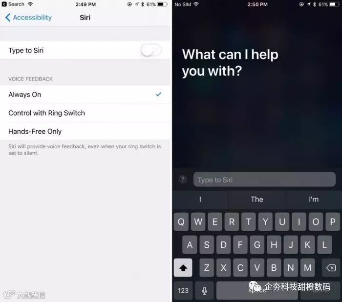 这是一项辅助功能。在该选项激活之后,通过按击Home按钮激活访问Siri的时候,用户需要敲入文字来进行交流。
