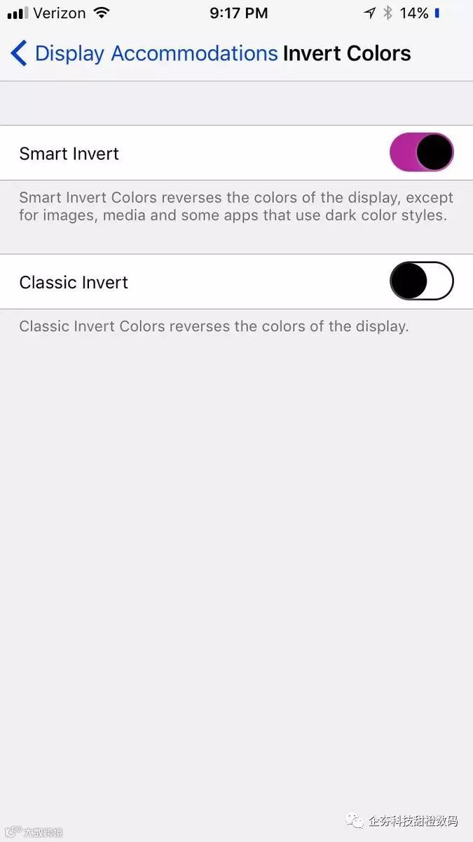 在设置的Accessibility区域中,在Accessibility > Display Accommodations > Invert Colors(辅助功能》显示调节》反转颜色)条目下有个“Smart Invert”选项。该选项能够除了图像、媒体和部分应用之外反转屏幕颜色。这有点类似于用户期待的黑暗模式,但是该选项并不适用于所有UI元素。