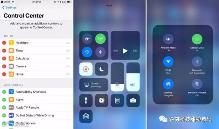 在开幕演讲中苹果展示了全新设计的控制中心,但并未提及该控制中心能够根据用户的使用习惯进行个性化调整。用户能够在设置中选择想要在控制中心显示的内容,在设置中提供了丰富的选项,包括低电模式、便签、文字尺寸、钱包、截屏等等。此外还允许添加Apple TV遥控至控制中心,不过遗憾的是布局并不能调整。