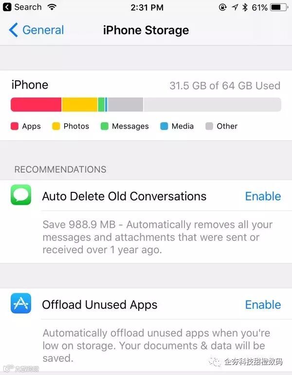 “存储和iCloud存储”标签已经更名为“iPhone存储”,在这里用户能够非常直观的了解当前手机的存储情况,并推荐自动删除时间比较久远的聊天记录,清理Messages附件,存储在iCloud上的Messages等等。