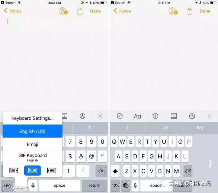 在iPhone上,通过按击“环球”键盘按钮,你能够在跳出的选项中选择单手键盘。此外该键盘能够根据左右手习惯进行切换。
