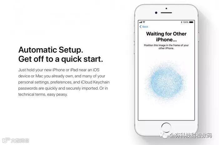 当你设置新的iOS设备的时候,将设备放置并靠近现有设备的时候能够自动复制设置、偏好和iCloud Keychain。