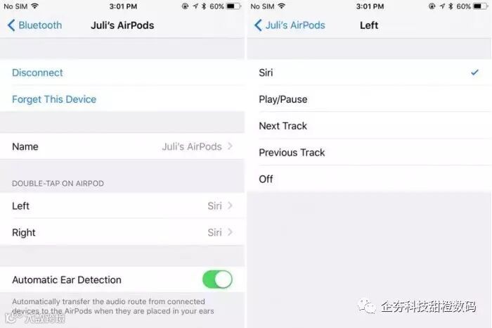 AirPods能够通过双击左边和右边的AirPod来触发相应的操作,例如,一边能够触发Siri,另一边触发下一首。在iOS 10系统中,AirPods的双击设置则只有一种功能。