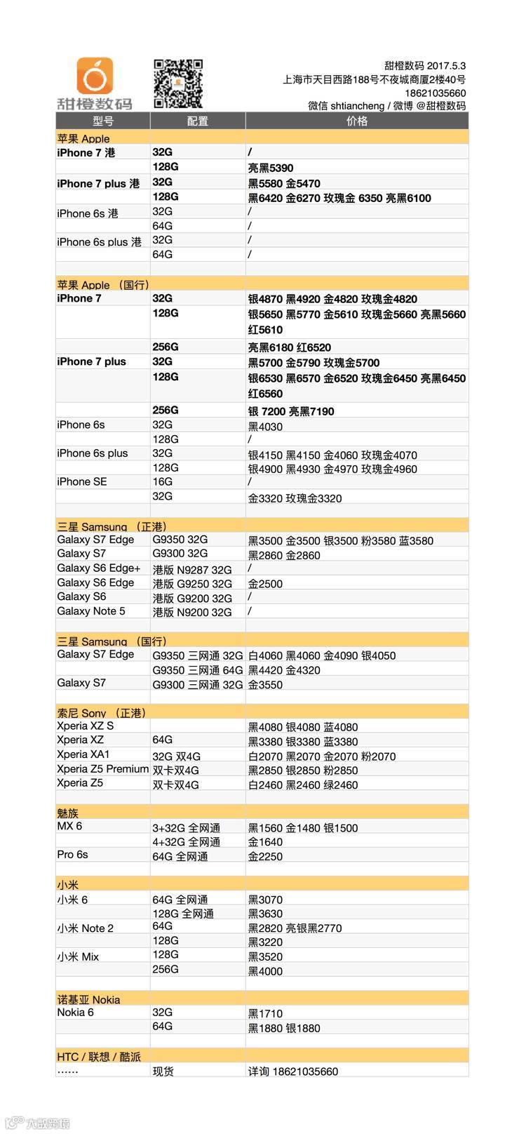 iPhone 7 及 plus 港版国行版继续小幅震荡走势;索尼 Xperia XA1 再次走低;三星 Galaxy 各款价格稳定;小米 6 继 64G 机型后 128G 配置版现货也已到店。