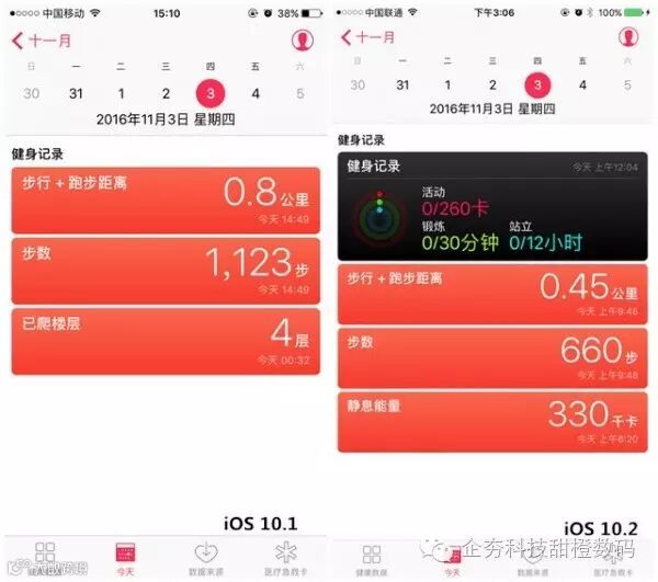 在 iOS 10.2 的健康应用中,点击「今日」,你会看到除了平常三项数据之外还增加了一个 Apple Watch 显示窗,对应的是手表健身记录,可看到卡路里消耗,锻炼时间和站立时间。