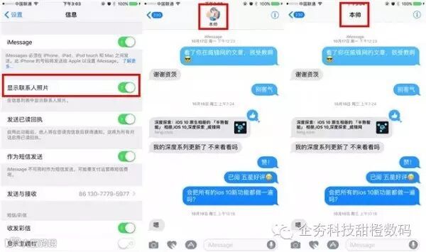 打开「设置 - 信息」,可以看到「显示联系人照片」的开关,关掉之后整个信息列表都不再显示头像,而短信对话界面顶部也不出现头像了。