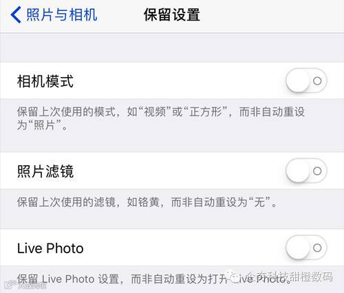 现在你可以在「设置 - 照片与相机」中看到一个新增的「保留设置」选项,点击进入后可以看到相机模式、照片滤镜和 Live Photo 开关,默认是关闭的。当保留设置开启之后,相机应用会记住你上次拍照的模式,包括上次选择的照片、视频、正方形、滤镜和 Live Photo 等,更为人性化了。