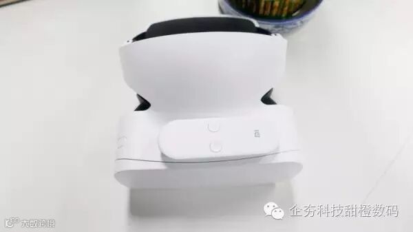 小米VR眼镜的设计像一顶顶部空着的帽子,外观为全白的配色,后脑勺有一个按键可以用来调整松紧度。佩戴时,将头带调松,戴上后再按住按键调到合适的紧度就可以。