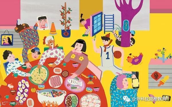 跳脱传统年画的框框,陈纯虹在她的《阖家团圆》中,呈现出一个既时尚又充满欢乐的年夜饭场景。她直接在 iMac 上进行创作,通过 Adobe Photoshop 来精确描绘色彩鲜明的、充满童趣的人物形象,并将她擅长的复杂印花图案细致地表现出来,让阖家团圆的喜庆与祝福,传遍千家万户。