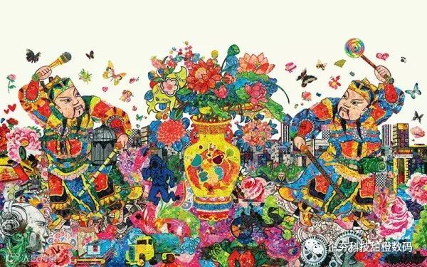 这幅作品的主体形象,来自叶红杏小时候看到的那些有寓意、有故事的年画。但特别不同的是,她在传统布局上融入了许多现代元素。在 Macbook Pro 上运用 Adobe Photoshop 构图之后,她在画布上再次创作,用大量绚丽的、体现当代生活的贴纸贴出整个画面。碎片式的贴纸不仅贴合“岁岁平安”的谐音和寓意,也反映出当下多彩生活中的点点滴滴。