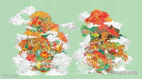 一种丰富繁盛、又极其梦幻的感觉,是周范这幅年画所表现出的意境。他的灵感来自记忆深处:红色的灯笼,喧天的鞭炮,满眼望不尽的热烈色彩。他先精细地手绘出各种细节,再在 Macbook Pro 上运用 Adobe Photoshop 将它们相互叠加,堆出一个高耸入云的丰收场景。这让传统的新年祈愿,多了一份超现实的艺术感。