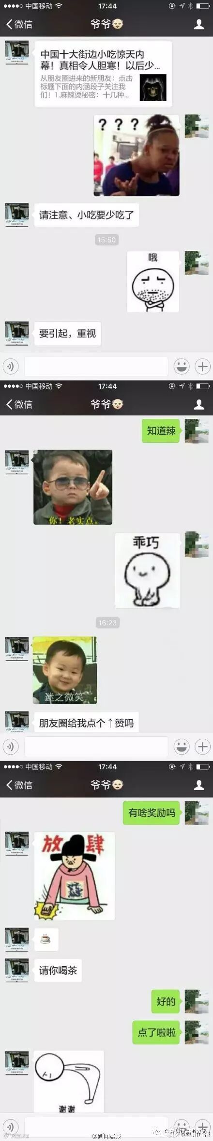 都说人与人2岁一个代沟,那这么算来,爷爷和孙女之间的代沟都能赶上马里亚纳海沟了,不过下面这对爷孙却一起玩的特别嗨,爷爷在孙女的影响下还学会了自制“表情包”,不禁让网友们感叹:又是别人家的爷爷!近日,有网友爆料称,自己的爷爷学会用手机后喜欢上了斗图和抢红包,现在玩得比自己还溜,而且和一般的中老跑马灯、坝坝舞斗图风不同,老爷子用的都是时下年轻人喜欢用的各种表情图。