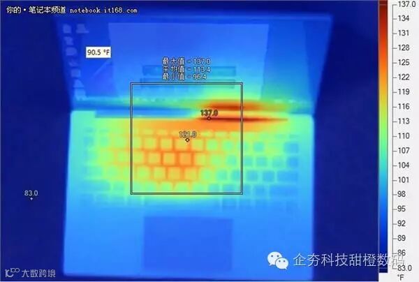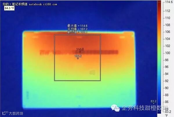 测试过程中,我们利用华氏度对该机的温度分布进行统计,我们可以看该机正面最高温度可达137华氏度=58.3摄氏度,平均温度在113.4华氏度=45.2摄氏度,热量主要分布在转轴散热处和键盘中上方;而机身背面最高温度为114.6华氏度=45.9摄氏度,平均温度为107.2华氏度=41.8摄氏度,热量主要分布在进风口正上方。整体来看,该机的散热表现一般,不过该测试将所有硬件占用率均调至了100%,而在实际办公或者游戏中CPU、显卡等占用率远不及此,因此正常情况下温度会降低很多,散热效果也自然更好一些。而在之后的具体体验,我们也并没有发现过热现象,因此散热还是可以让人接受的。