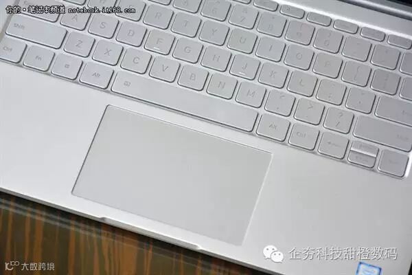 该机整机采用三种材质,包括铝合金金属材质的全金属机身(A面、D面和C面掌托位置)、采用复合材质的键盘、以及玻璃材质的显示屏和触控板。其中采用喷砂处理的金属材质模块上文我们已经详细说明,接下来我们要说的是采用复合材质的键盘。