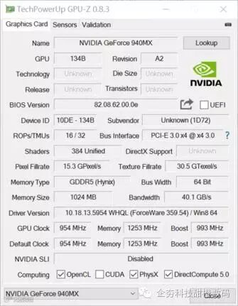▲英特尔HD 520核心显卡 英伟达GT940MX 1G显存独立显卡,其中GT940MX独立显卡性能高GT940M大概10%-20%,整体性能介于GTX 750M和GTX 950M之间,性能还是十分不错的。