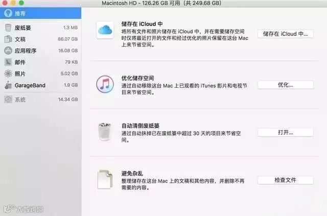 此外用户也可以在硬盘管理中进行手动优化,包括自主选择将哪些文件保存在云端、删除垃圾文件、清理废纸篓、删除看过的iTunes影片缓存等。