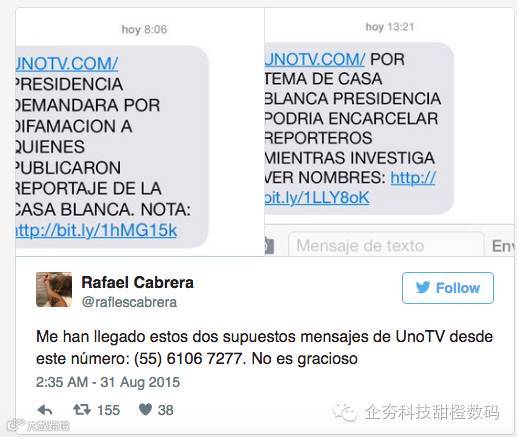 研究人员们还没能找到其他 Pegasus 间谍软件的样本。但通过搜索类似链接和与此次攻击以及 Stealth Falcon 有关的域名,他们发现了一条疑似针对肯尼亚不知名受害者的推文,还有一次针对墨西哥调查记者 Rafael Cabrera 的攻击。