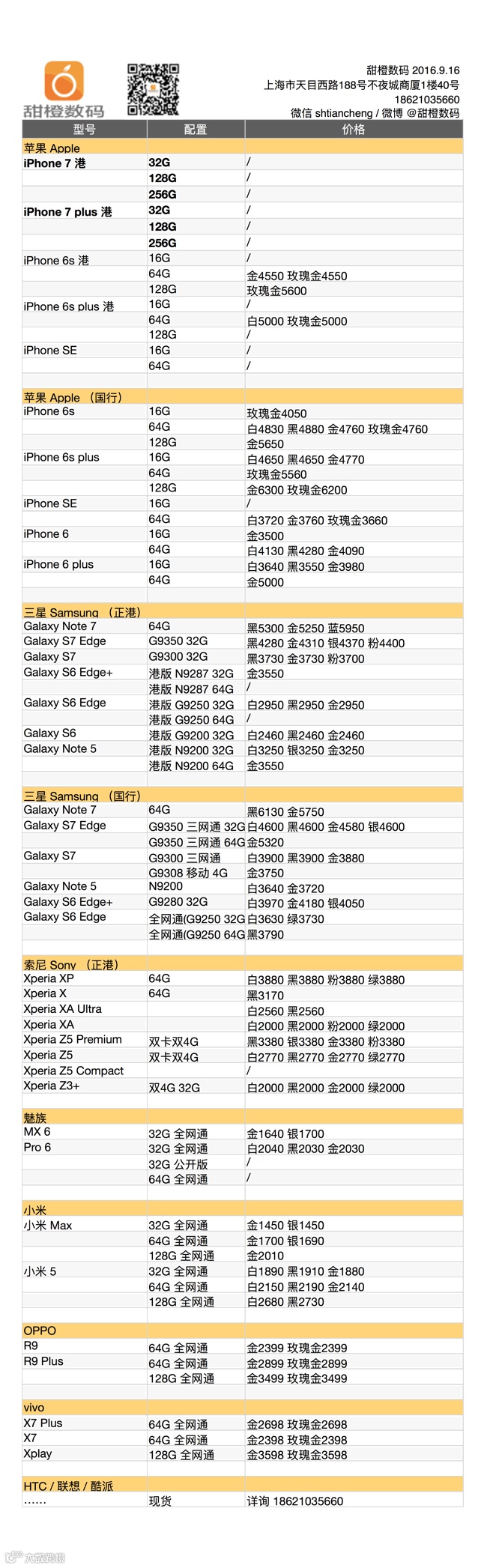 iPhone 7 及 plus 现货已经到店,目前价格波动频繁,如需要购买可拨打 18621035660 咨询即时价格;三星 Galaxy Note 7 及 S7 Edge 价格小幅走低,S7 和 S6 等机型价格稳定;魅族、小米的各款机型有 1、20 元的小幅走低。