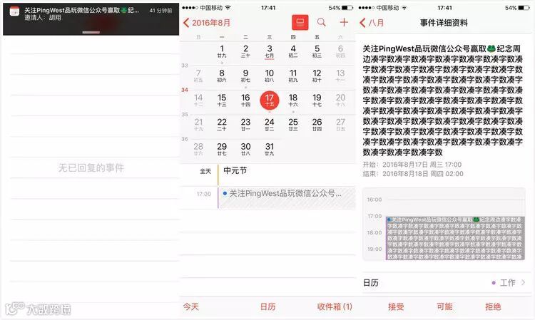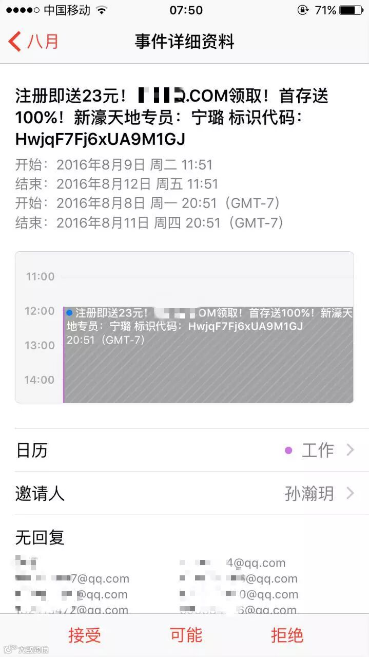 有人认为是自己的 Apple ID 被盗或者中了病毒,实际上,这事可能没这么邪乎。我和朋友进行了一场模拟试验。已知朋友的 Apple ID 的关联邮箱,我在日历上新建一个事件,发送邀请给朋友的关联邮箱,标题和地址都可以修改成自己想要的广告内容,苹果日历的标题不限制字数,于是有了下面如此夸张的效果。而设置好邀请事件的时间段(比如上午7:00——下午9:00),在日历上便会占据一天的可见范围。
