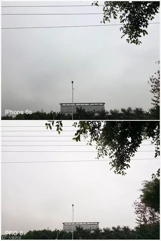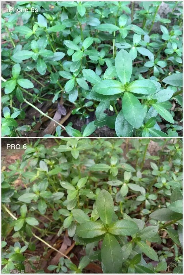 而在第二张绿叶的照片中,iPhone6s 又出现了绿叶颜色过于饱和的情况,使得颜色看起来非常假,而 PRO 6 的还原则相对准确。 第三张天空里,两者表现基本持平,天空绿叶的边缘 PRO 6 的解析要相对较好,但不具备明显的优势。