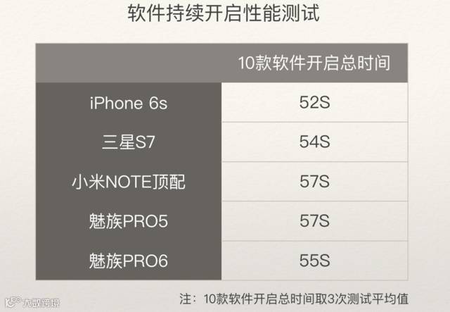 iPhone6s plus( Apple A9 )、三星 S 7( 骁龙 820 )、小米 note( 骁龙 810 )、PRO 5( Exynos 7420 )、PRO 6( Helio X25 )