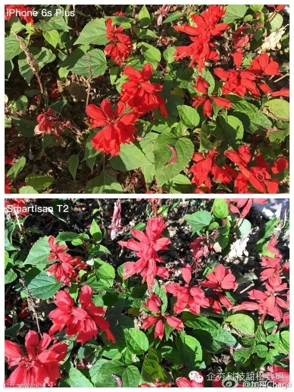 T2 的拍照素质表现有点超出我的预期,IMX214 这颗索尼 2014 发布的摄像头依然老当益壮,其性能从T2的表现上来看,已经被锤子的工程师门吃的很透了,抛开不支持相位对焦的硬伤,从观感上来说,T2 的表现比起其他刚入门手机的厂商要好的多,无论是色彩还原,噪点控制,画面纯净度等方面都有不错的表现,而主要的问题则在于白平衡有轻微的偏蓝,以及在拍摄部分颜色鲜艳的物体时,色彩饱和度有点过高,比如第二组中的红花,实际的颜色更偏向于 iPhone 的深红,而 T2 上已经表现的有些偏粉,T2绿叶的颜色也显得有些绿的发亮。
