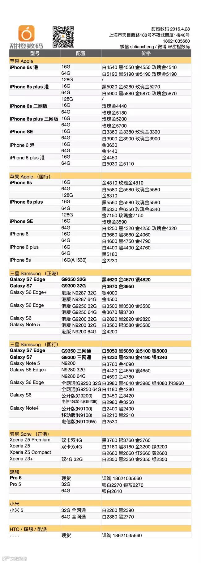 iPhone 6s 价格稳定,而 plus 版则小幅走低;iPhone 6 及 plus 港版、国行版稳定;iPhone SE 暂无变化;三星 Galaxy S7 系列大步下行。