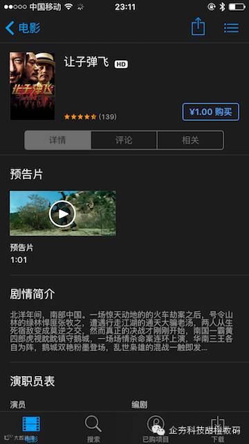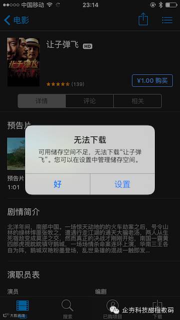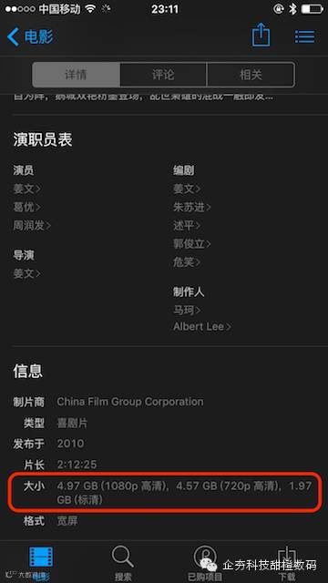 2、打开 iTunes Store,选择一部大容量电影。这里选的是《让子弹飞》,1080p高清版 4.97GB 大小,对这部手机而言足够了。