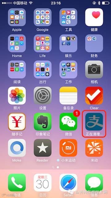 9、好了,到此为止。我们来看看苹果做了什么,请注意支付宝图标上的“正在清理…”字样。