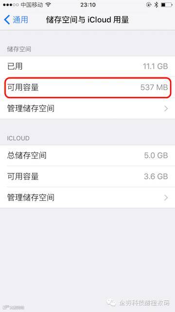 1、先查看当前的可用容量,路径“设置——通用——存储空间与 iCloud 用量”。这里是537MB。