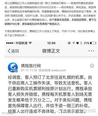前几日,微信公众号“李淼”公开发帖称,自己在携程花费1.2万预定了两张国际机票并显示成功出票,结果到达机场后被告知票号无效系伪造。该消息被传播后,一大波受害用户闻讯赶来,曝光了自己在携程遭遇的各种骗局,包括买的比官网还贵、退票乱扣钱、到机场无法登机等等。随后,携程公开声明称,原因已查明,是供应商违规操作或供应商员工操作失误造成的。