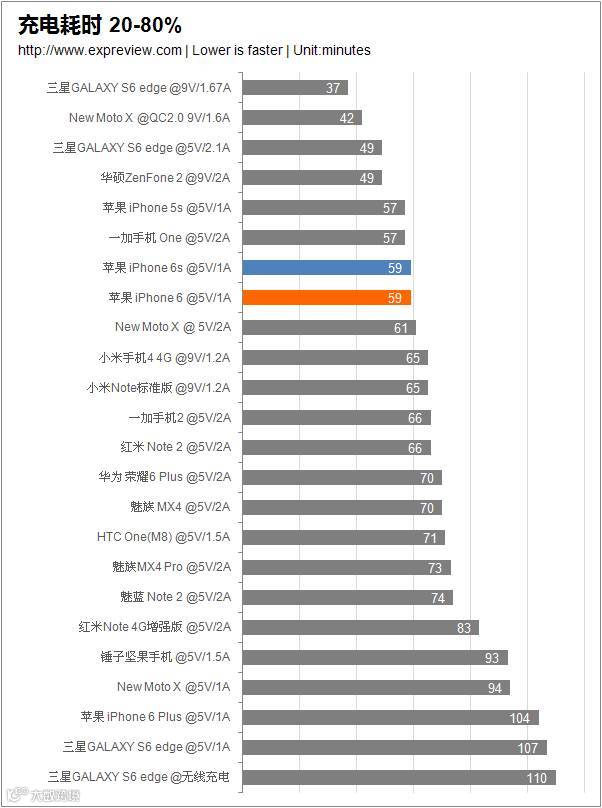 以下是iPhone 6s评测中的充电速度数据。可以见到使用了快速充电技术三星Galaxy S6 edge、New Moto X、华硕Zenfone 2拥有非常快的充电速度。