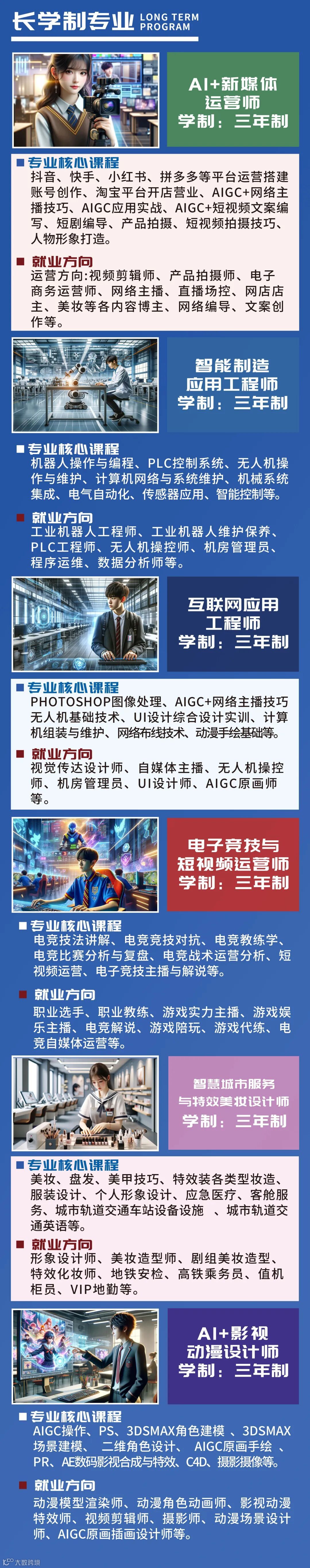 沈阳新华紧跟人才市场需求以及企业岗位需求,以学生兴趣点为出发点,开设影视动漫、电商直播、平面设计、拍摄剪辑、软件开发、电子竞技等互联网IT相关专业,以及无人机、美妆、工业机器人应用等热门专业,帮助学生学好一技之长,获得更好的未来。