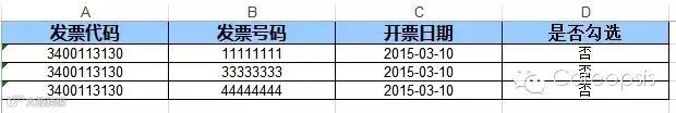 2、单元格内容依次为发票代码、发票号码、开票日期、是否勾选;