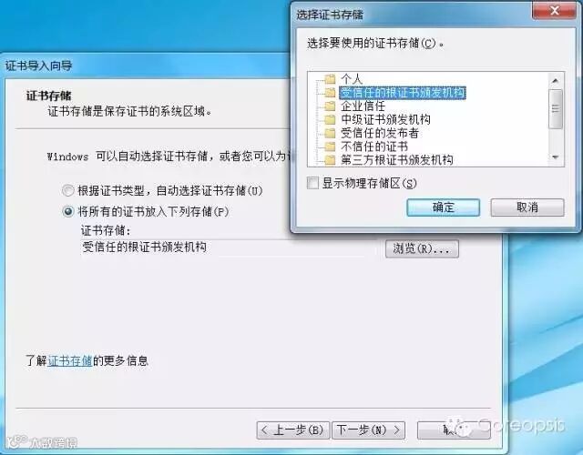 4、选择“将所有的证书放入下列存储”,然后点击“浏览(R)...”,并选择“受信任的根证书颁发机构”,再点击“确认”。