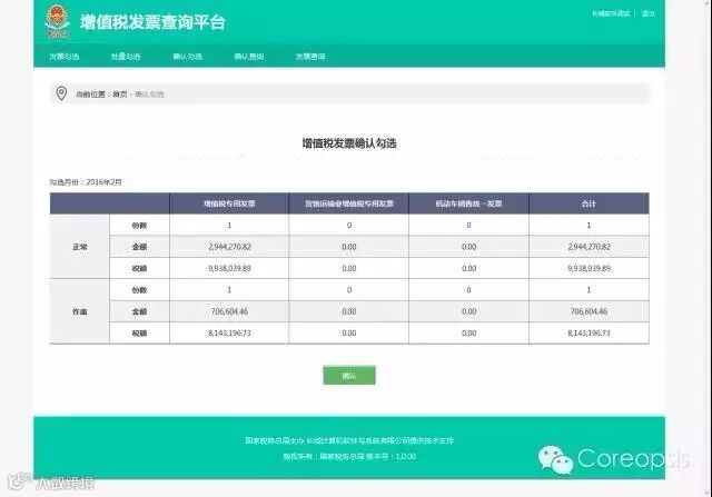 1、点击”确认勾选“菜单,系统会自动连接局端后台系统实时统计出本月已勾选的发票汇总情况,如下图所示: