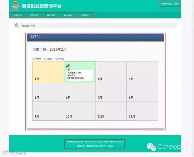 中间部分为工作台区域,可以查看当前年度内各月增值税进项发票的勾选确认情况,根据勾选确认的操作情况用三种颜色来标识不同的状态: