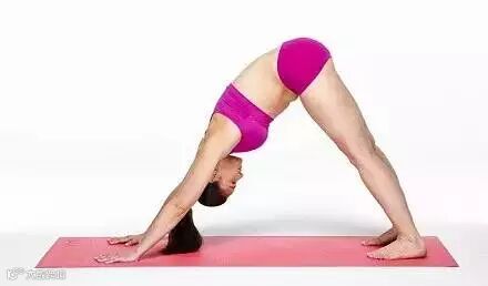 呼气并呈下犬式。双手向前移动,分开距离略大于肩距,伸展五指触地保持稳定性。弯曲身体、抬起臀部使身体呈一个三角形,臀部为其中一个顶点。颈部和肩部放松。如果感觉肌肉拉得过紧,可适度弯曲膝盖。保持此姿势做五次深呼吸。