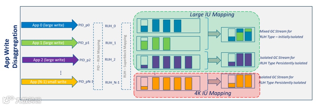 减少大 IU 上小写入造成的 WAF,支持 4K IU 的 RUH 和 16K IU 的 RUH。应用程序可将小规模写入放在 4K IU 的 RUH 上。