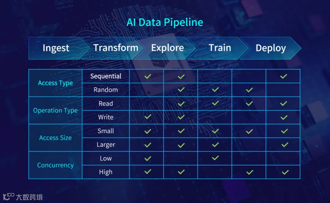 QLC以其大容量和高能耗比等特点,成为当前读取密集应用场景的重要选择。但在AI服务器中,数据处理包含采集、准备、训练及推理等过程,在这一流程中存在着存取类型多样(如顺序读写与随机存取)、操作类型复杂(读、写、更新)、存取大小不一(小块数据与大文件混合)以及并发性等特征。