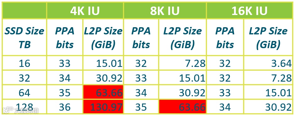 利用硬件辅助的位打包L2P条目进一步节省L2P表空间。例如,使用 33 位条目(而不是 40 位)来寻址 8G IU,可进一步将 L2P 的大小减少到 17.5%。