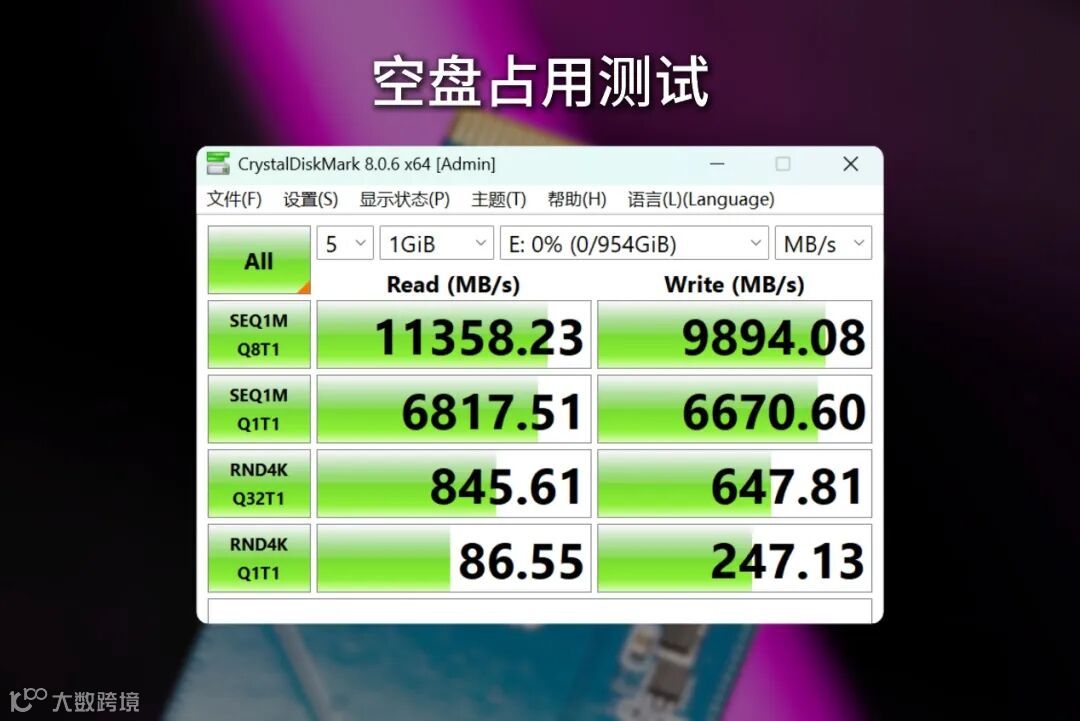 以搭载SM2504XT主控芯片的SSD样品为例,其在CrystalDiskMark文件大小1 GB的测试中,连续读写速度分别为11,358.23 MB/s与9,894.08 MB/s,不仅满足官方标称数据,性能更是远超远超PCIe 4.0旗舰产品。而更能反映系统流畅度的随机读写测试中,得益于三核CPU的强大算力与HMB优化,也取得了86.55 MB/s与247.13 MB/s的佳绩。